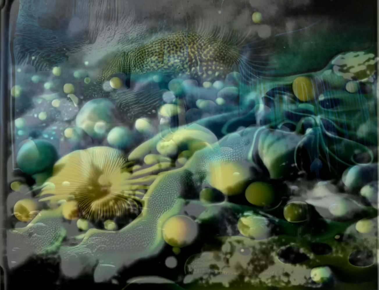 The original black and white material from which this work is “cloned” is compiled from a mix of loops from public domain early films, including the first ever moving media depiction of Frankenstein, as well as an Encylopaedia Britannica documentary on biology, hand contact-printed onto the last reel of extinct 150-yr old ORWO film stock by Amy Cutler and James Holcombe in the EREWHON dark room laboratory in Frome in July 2023. The machine learning processes then strive towards reworking this footage according to priority vocabularies from current de-extinction science (as well as its own bias towards the decorative). However, the AI is neither free to purely copy the original nor to create its own pure new thing; its resurrections are constrained by the extant forms of the archive, which themselves flicker in and out of existence based on exposure and development time. What emerges, although the result of machine co-production, resembles the speculative colour fantasies of bespoke early hand-tinted and painted cinema far more than the slick, homogenous realism of contemporary AI 'de-aging' or 'colourisation' tools often applied to old footage, such as the Tasmanian tiger. It is much more gelatinous, gaudy, Gothic, science-fictional, and extremely driven by the visual bias of our genetic imaginaries and the cultural contexts of extinction.